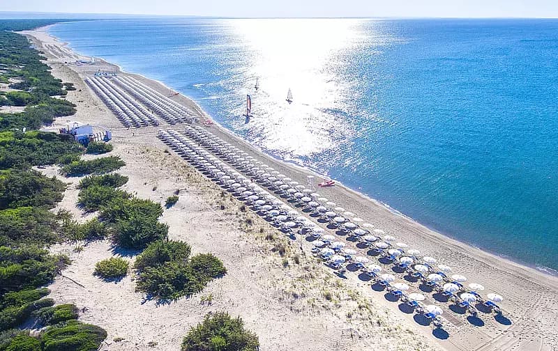 La struttura offre un accesso diretto a una spiaggia di sabbia fine, attrezzata con ombrelloni, lettini e sdraio riservati per ogni camera. È disponibile un servizio navetta gratuito per raggiungere il mare, garantendo comodità e praticità per gli ospiti. La spiaggia è perfetta per famiglie, grazie alla sua acqua bassa che consente ai bambini di giocare in sicurezza.